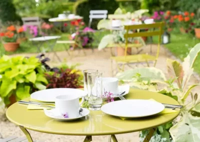 Tables, chaises et accessoires pour aménager des espaces confortables et pratiques. Le matériel facilite la circulation des invités.